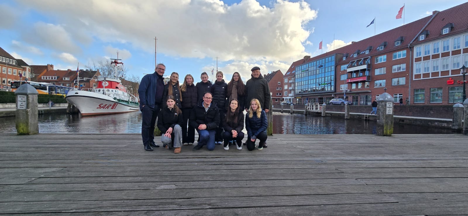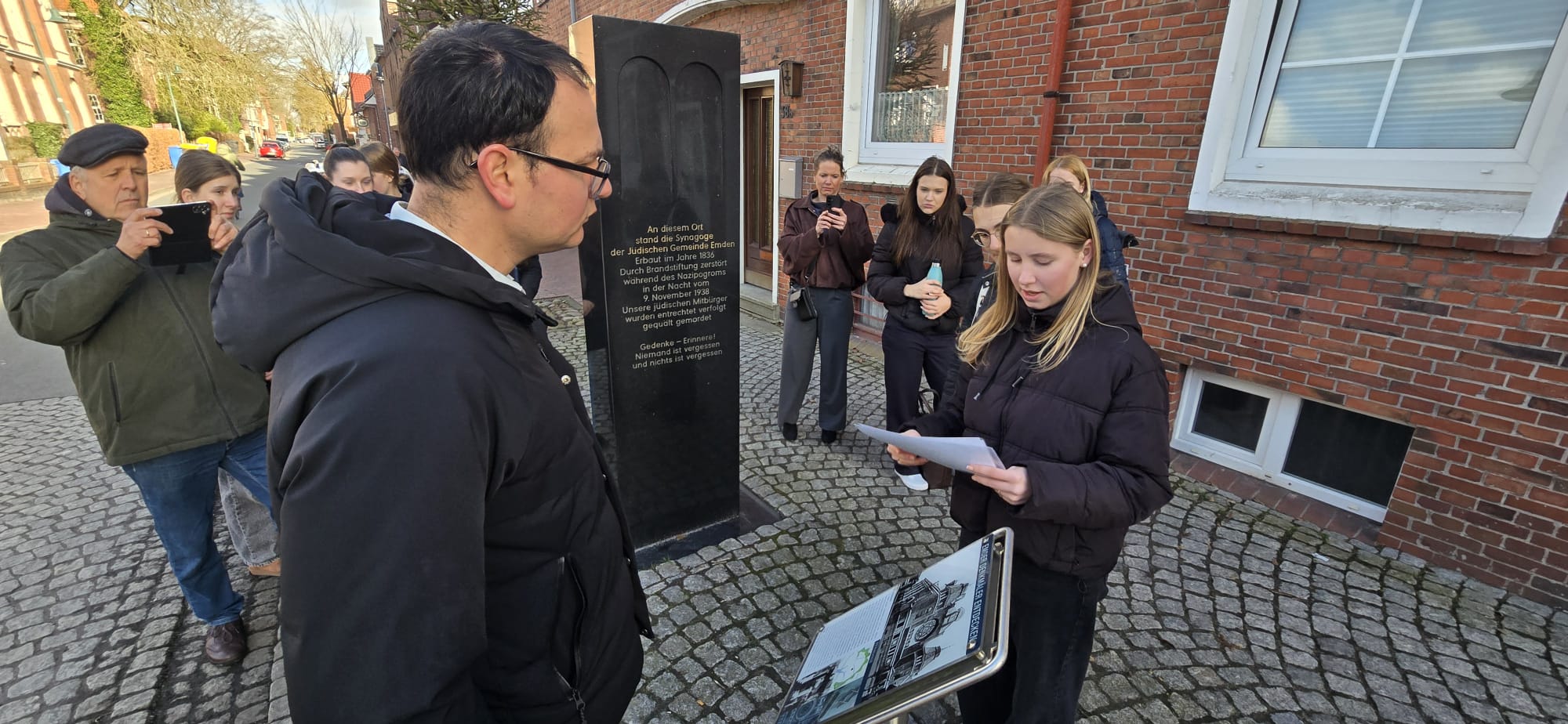 Zu Beginn des Tages trafen wir uns im Landesmuseum, wo wir gemeinsam mit unserer stellvertretenden Schulleiterin an einer besonderen Führung teilnahmen, die von unserem Oberbürgermeister geleitet wurde. Anschließend machten wir einen Rundgang durch die Emder Innenstadt. Dabei lag der Fokus besonders auf wichtigen Orten im Zusammenhang mit der Zeit des Nationalsozialismus. So berichteten wir an verschiedenen Stationen Reichspogromnacht in Emden und das Schicksal der Familie de Beer, deren Nachfahren im vergangenen Jahr zu Gast bei uns waren.