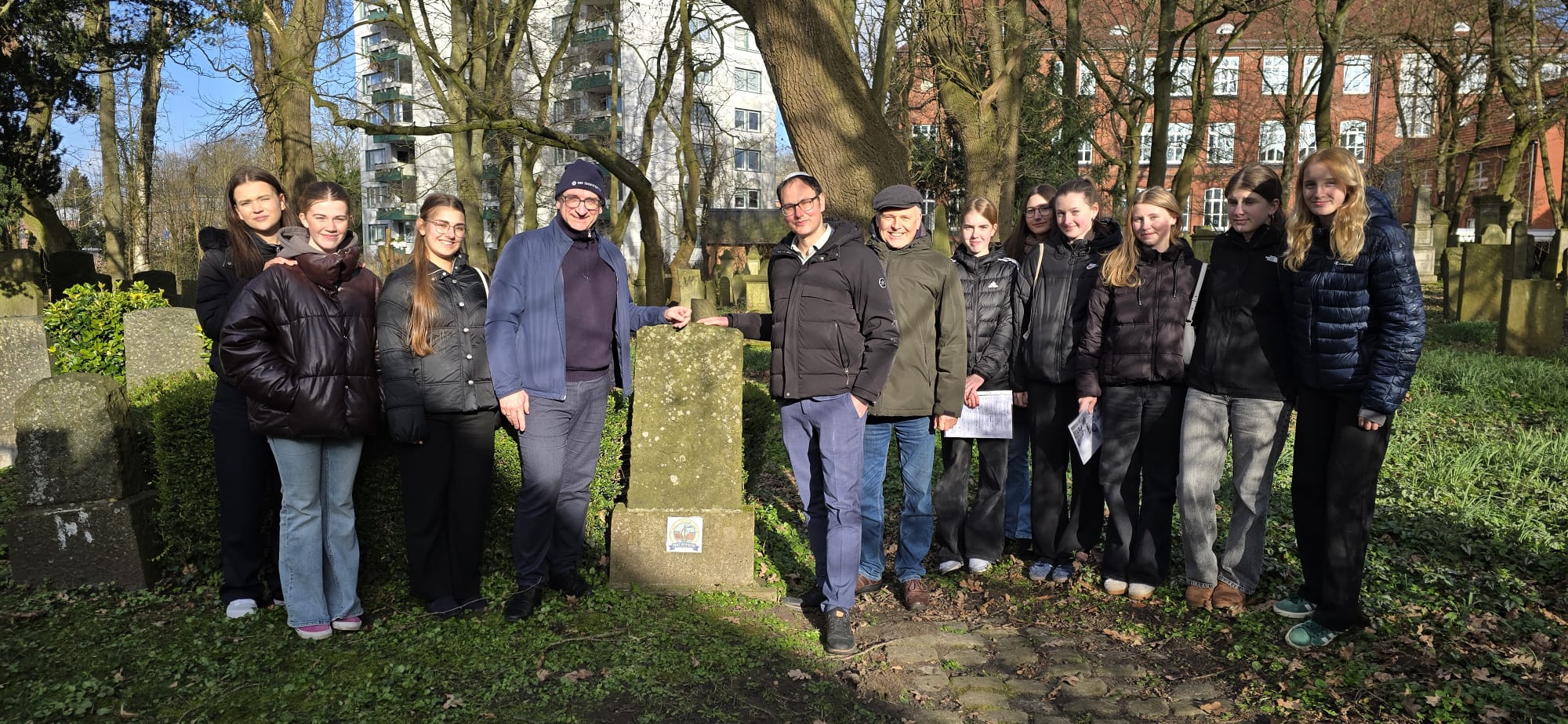 Ein besonders bewegender Moment war der Besuch der Stolpersteine für die Familie Windmüller. Dort erinnerten wir an die Schicksale von Max, seinen Eltern und Geschwistern und berichteten von deren Leben und Verfolgung. Ein weiterer wichtiger Programmpunkt war der Besuch des jüdischen Friedhofs in Emden. Dort stellten wir die Geschichte der Exodus ebenso vor wie die Biografien der Familie Leufgen.