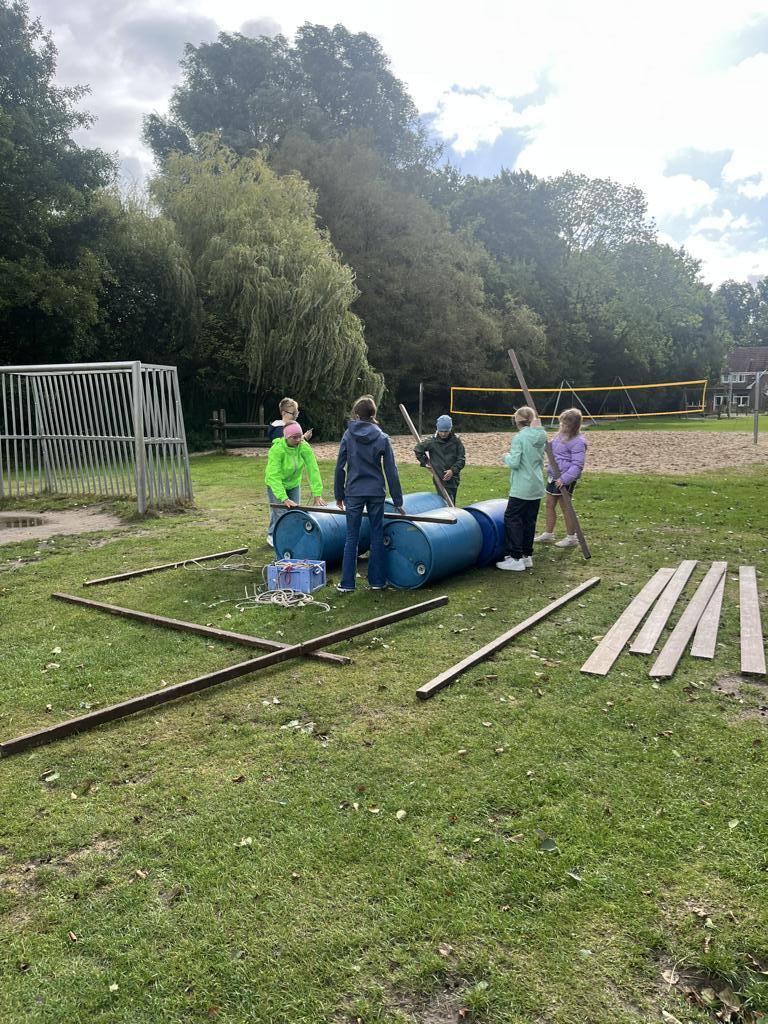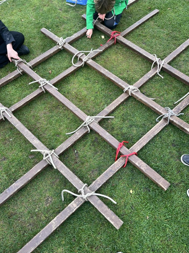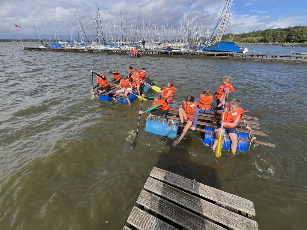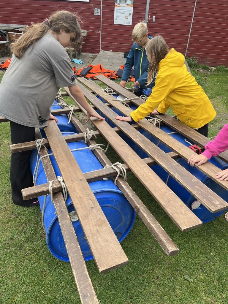 Am nächsten Morgen wurden wir gleich von Regen empfangen. Ausgestattet mit Regenkleidung starteten wir trotzdem motiviert unser Projekt Floßbau. Nach einer kurzen Einführung ins Knotenbinden bildeten wir Gruppen und begannen, Holz und Seile zusammenzufügen. Das nasse Holz war rutschig, die Seile kalt und die Arbeit nicht immer leicht. Es knirschte in den Teams, doch mit Hilfe der Teamer und unserer Lehrkräfte fanden wir Lösungen und bauten schließlich stabile Flöße. Der spannendste Moment kam beim Zuwasserlassen: Erst schwankten die Flöße bedenklich, doch dann hielten sie und trugen uns über das Zwischenahner Meer. Abends rundeten wir den Tag mit dem Spiel „Werwolf“ ab. Nach einer Proberunde, ein paar Schummeleien und viel Gelächter ging es müde, aber zufrieden ins Bett.