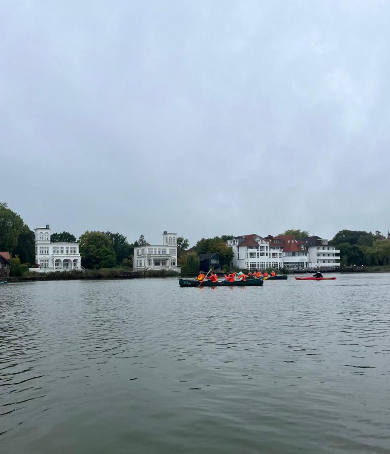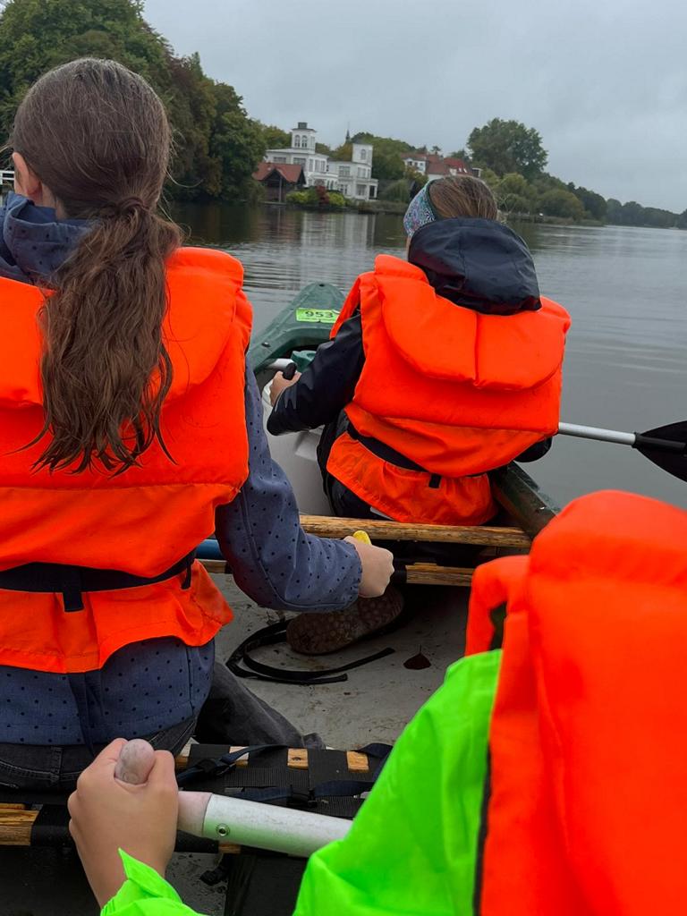 Am Donnerstag stand die letzte Aktion auf dem Wasser an: Eine Kanutour. Schon am Morgen nieselte es leicht, doch wir ließen uns davon nicht die Laune verderben. Dank der Vorkenntnisse aus dem Ruderunterricht lief der Aufbau der Boote problemlos. Auf dem Wasser merkten wir aber schnell, dass es nicht für alle ganz einfach war: Einige hatten Schwierigkeiten, das Kanu zu steuern oder im richtigen Rhythmus zu paddeln. Mit etwas Teamarbeit und gegenseitiger Hilfe klappte es am Ende trotzdem gut. Wir waren insgesamt recht schnell unterwegs und kamen so früh wieder an Land, dass noch Zeit für eine Stadterkundung blieb.