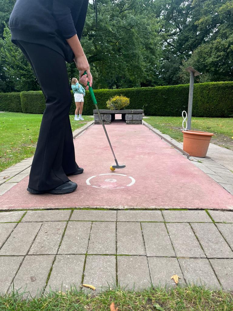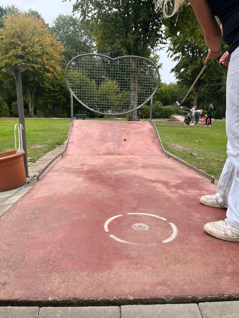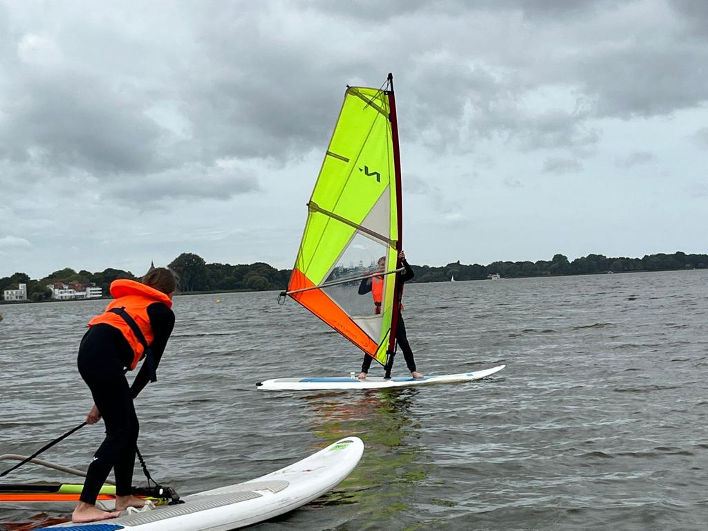 Am dritten Tag hatten wir optimale Bedingungen zum Windsurfen: Leichter Wind und glattes Wasser. Wir wurden in zwei Gruppen eingeteilt. Die erste Gruppe durfte am Vormittag aufs Wasser, während die andere parallel Beachvolleyball spielte. Nach einer kurzen Einweisung an Land – wie das Segel gehalten und der Wind richtig genutzt wird – zogen wir unsere Neoprenanzüge an. Schon das Anziehen war ein Erlebnis: eng, warm und etwas ungewohnt. Dann ging es endlich hinaus aufs Wasser. Die ersten Versuche waren noch wackelig, manche landeten sofort wieder im kühlen Nass, doch Schritt für Schritt gelang es immer besser, das Gleichgewicht zu halten und kurze Strecken zu fahren. Nach und nach stellten sich kleine Erfolge ein: die ersten Meter aufrecht, die ersten Wendemanöver – und das Gefühl, tatsächlich vom Wind getragen zu werden. Nachmittags stand außerdem noch eine Runde Minigolf auf dem Programm, bei der es einige spannende Duelle gab. Abends spielten wir wieder Werwolf – und nach dem schwierigen Start zu Beginn der Woche wurde inzwischen immer strategischer gespielt.
