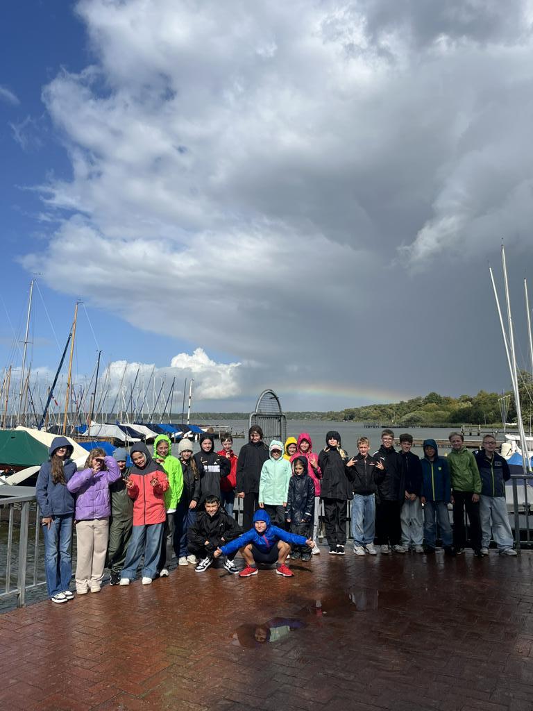 Unsere Klassenfahrt führte uns in diesem Jahr ans Wasser nach Bad Zwischenahn. Nach einer angenehmen Zugfahrt ohne Verspätungen kamen wir schnell am Zielort an. Nachdem wir die Zimmer bezogen hatten, machten wir uns direkt auf zur ersten Erkundungstour rund um das Zwischenahner Meer. Dabei begrüßte uns sogar ein Regenbogen, der schon die Vorboten des angekündigten Tiefdruckgebiets erahnen ließ.