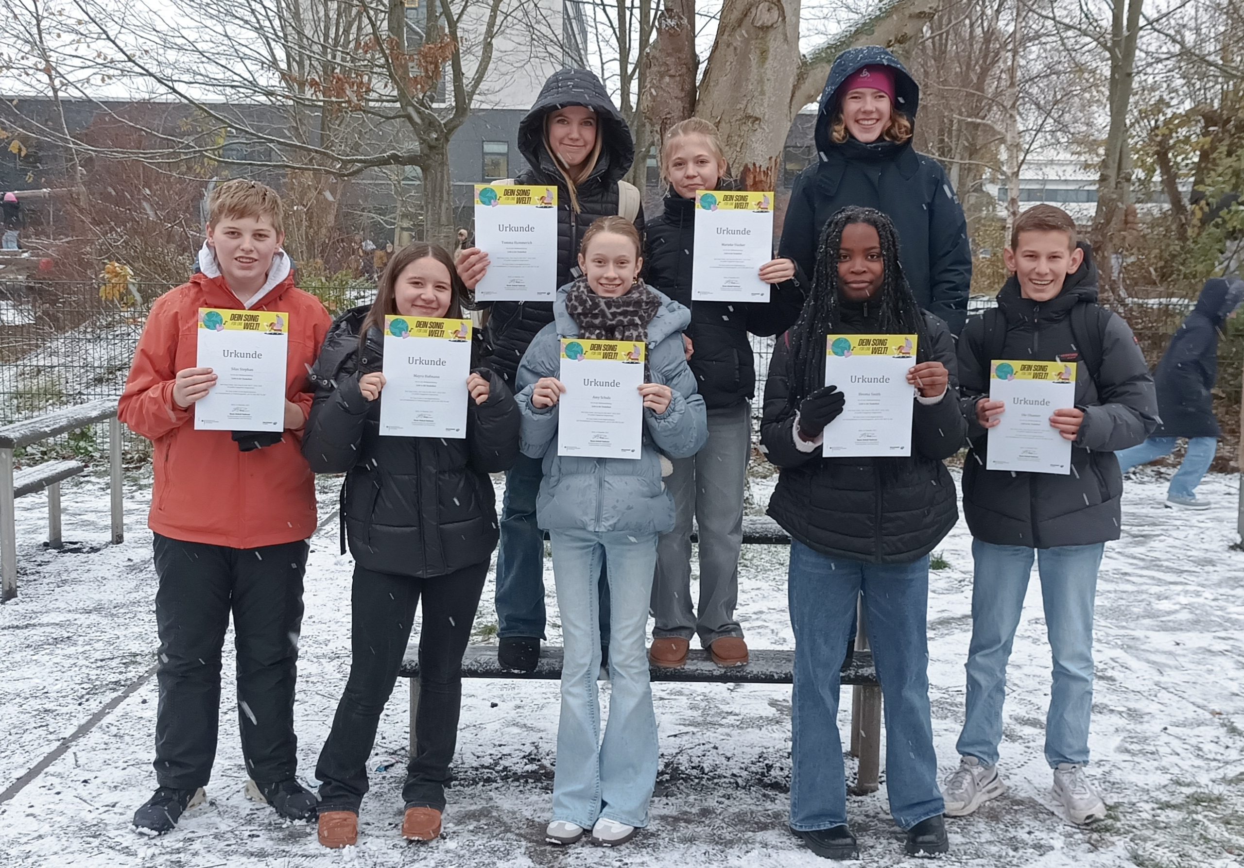 In schönster Winterstimmung mit Schneefall haben wir, die ehemalige 6c, Post aus Berlin erhalten. Im Umschlag waren für jeden uns Urkunden mit namentlicher Nennung für unsere Teilnahme am „Eine Welt“-Songcontest 2025 enthalten.
