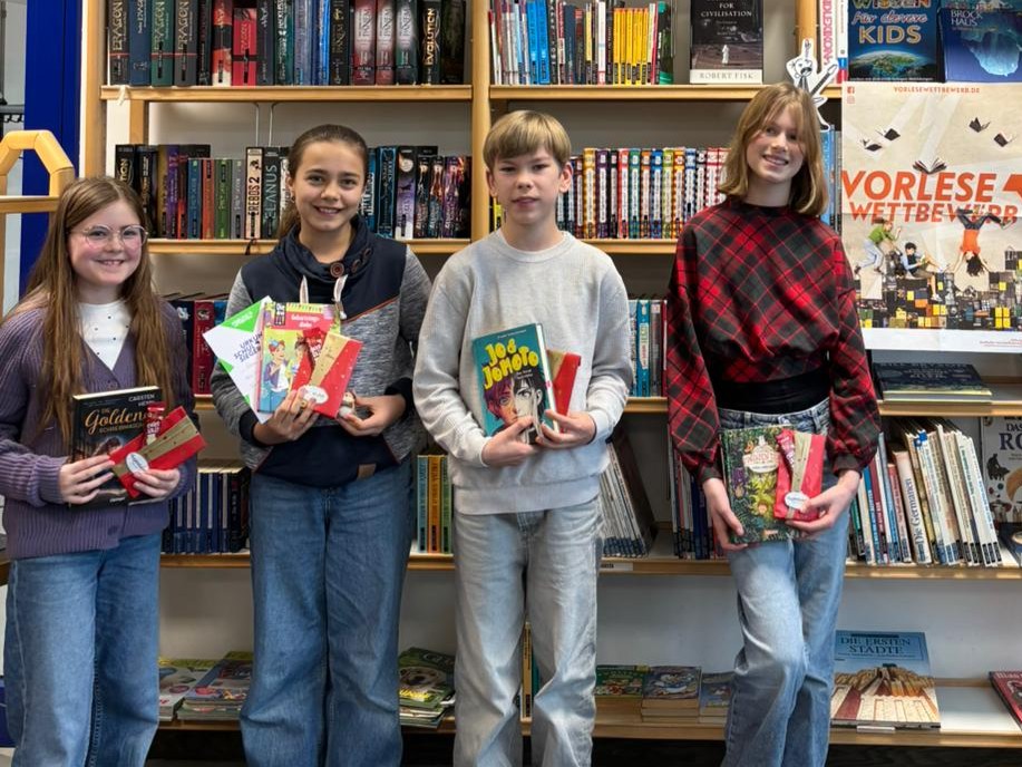 Die Schulbibliothek stellte den passenden Ort für das diesjährige Schulfinale des Vorlesewettbewerbes der 6. Klassen dar. In einem hochklassigen Wettbewerb traten für die 6a Jule Sonne, für die 6b Lukas Martin, für die 6c Rena Gruben und für die 6d Kira Wilts an. Alle hatten sich zuvor bereits in den jeweiligen Klassenfinals durchgesetzt. In zwei spannenden Runden, in denen ein Wahl- und ein Fremdtext gelesen werden mussten, setzte sich letztlich Rena aus der 6c durch, die aus dem Roman „Die drei Ausrufezeichen – Geburtstagsdiebe“ vorlas. Sie wird unsere Schule damit beim Stadtentscheid im nächsten Jahr gegen die Schulsieger der anderen Emder Schulen vertreten.