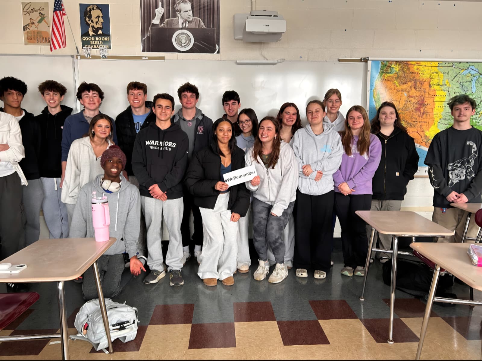 Dies passt auch zum jetzigen Thema, da wir gerade den Zweiten Weltkrieg und den Holocaust durchnehmen. Meine Mitschülern haben auf die Idee begeistert reagiert und es sind alle auf dem Foto.